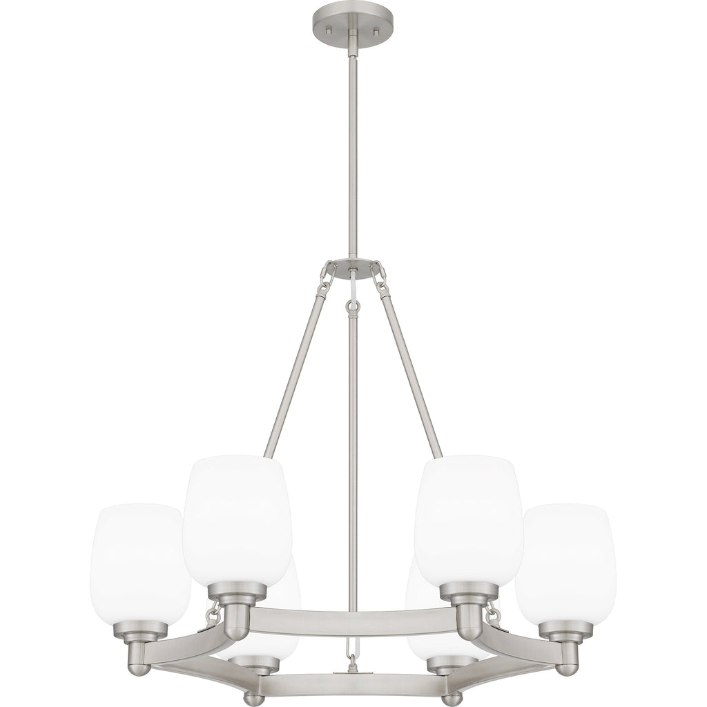 A fresh interpretation of the classic wagon wheel silhouette, Penning features opal etched glass shades that soFt ly cast light. Whether in brushed nickel or matte black, the Penning chandelier delivers on updated traditional style. Hang this chandelier or island light in a foyer, formal dining room or kitchen for timeless style.