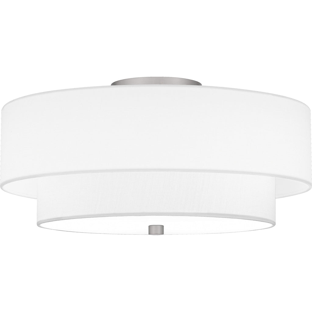 Prewett's understated style provides a soFt transitional look for most any room. The white fabric shade diffuses the light evenly, illuminating your home with a warm ambiance. Finished in brushed nickel, the Prewett semi-flush mount is a stylish choice in any foyer, hallway, bathroom, or home office.