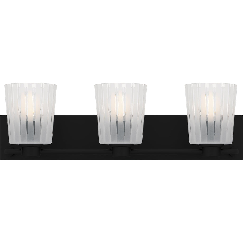 The Gray lighting collection offers a striking blend of transitional design and classic charm. The clear glass shades are characterized by distinct vertical ribs that create an intriguing interplay of light and shadow. Etched patterns in between the ribs further the visual effect of the unique shades. The matte black finish of the metal frame provides a sleek contrast to the textured glass. Gray is available as a mini pendant light, semi-flush mount, or in various sizes of bath light.