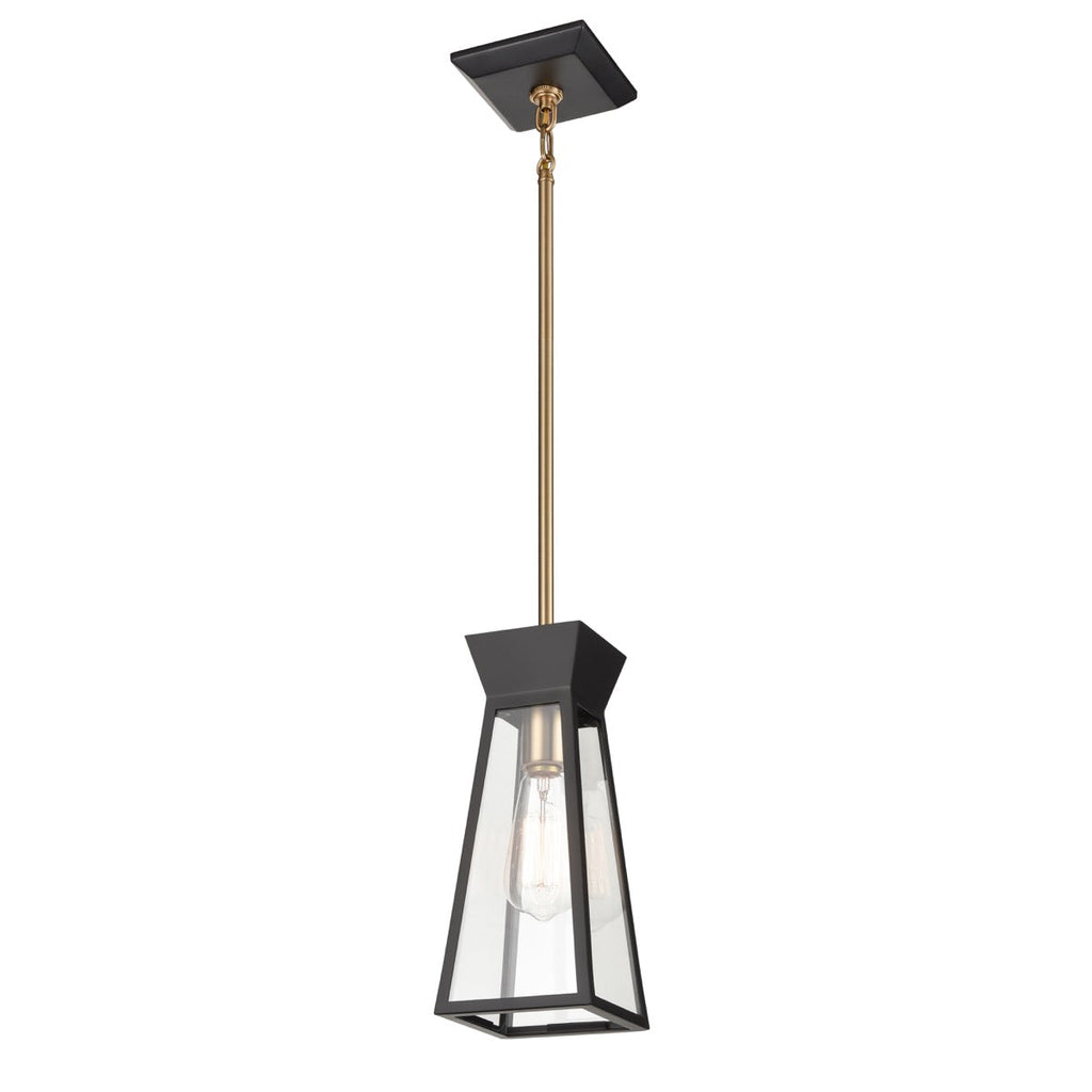 The Lucian collection, designed by Kevin Kraemer, is a modern twist on a classical lantern style light. Shown in a black with brushed brass accents (also available in a plated brushed brass finish). Clear panel glassware surrounding the bulb. The model shown is a single pendant which comes with extra rods for easy height adjustment and has a hangstraight to be compatible with sloped ceilings.
