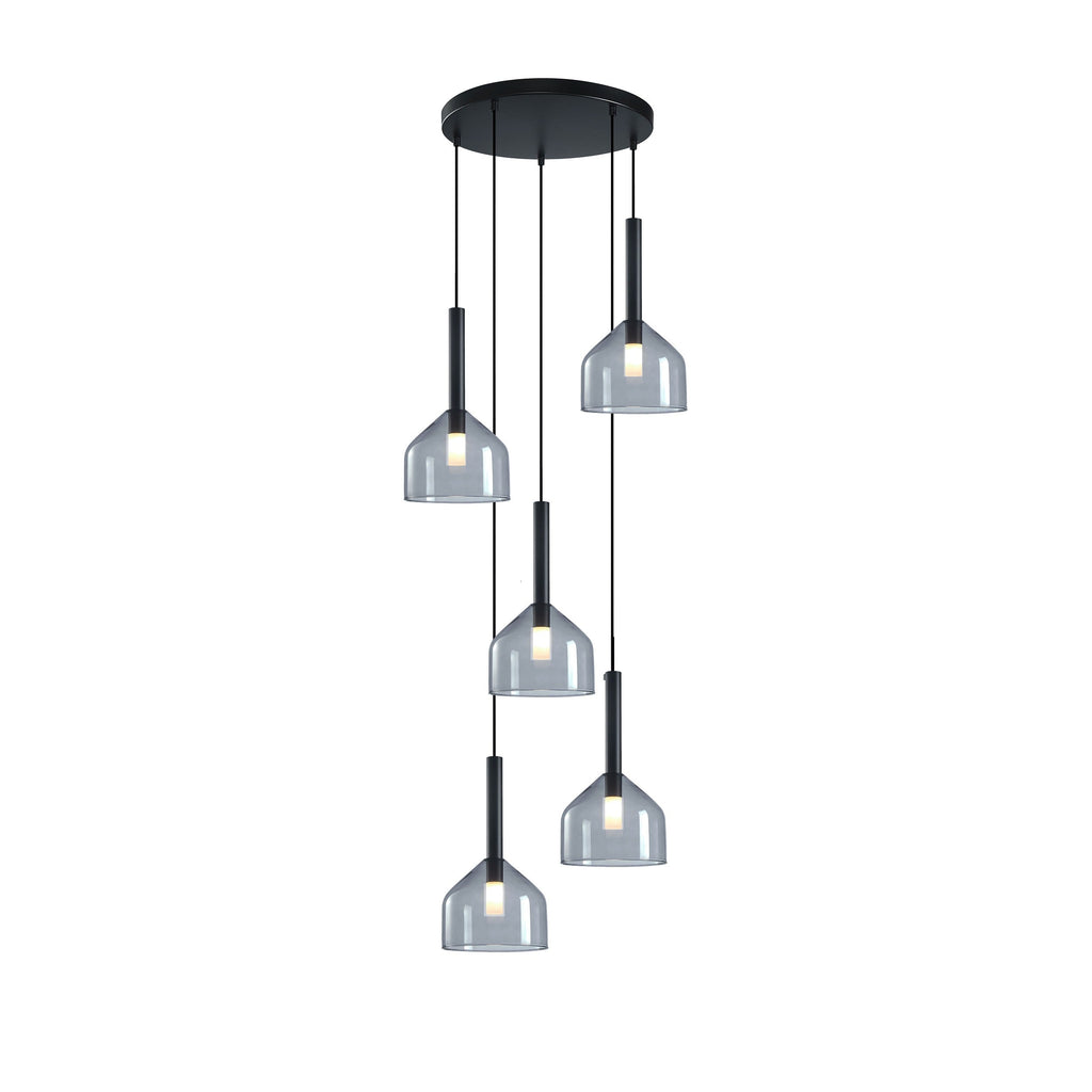 The Kali collection showcases a captivating design, featuring lightly smoked glassware suspended with sleek black wiring. Each glass element has an interior white bulb cover, adding a touch of subtlety to the lighting and creating a soft, ambient glow. 5 light foyer type pendant chandelier shown.