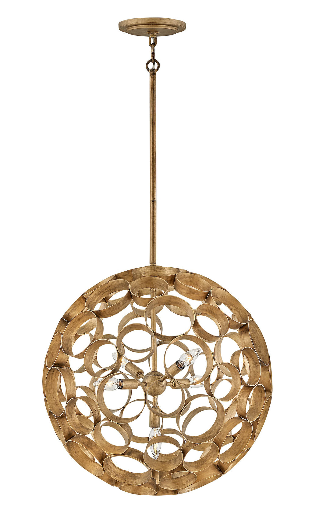 Hand-crafted, interconnected circles compose this stunning pendant. The unique construction, crafted in a modern Burnished Gold finish, forms an intricate globe encasing a starburst light cluster. Centric's stem-hung orb casts richly layered light patterns through its open frame sphere.