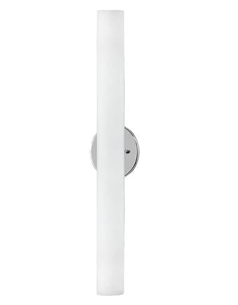 Single LED wall sconce with cylinder shaped white opal glass. Metal details in brushed nickel or chrome finish.