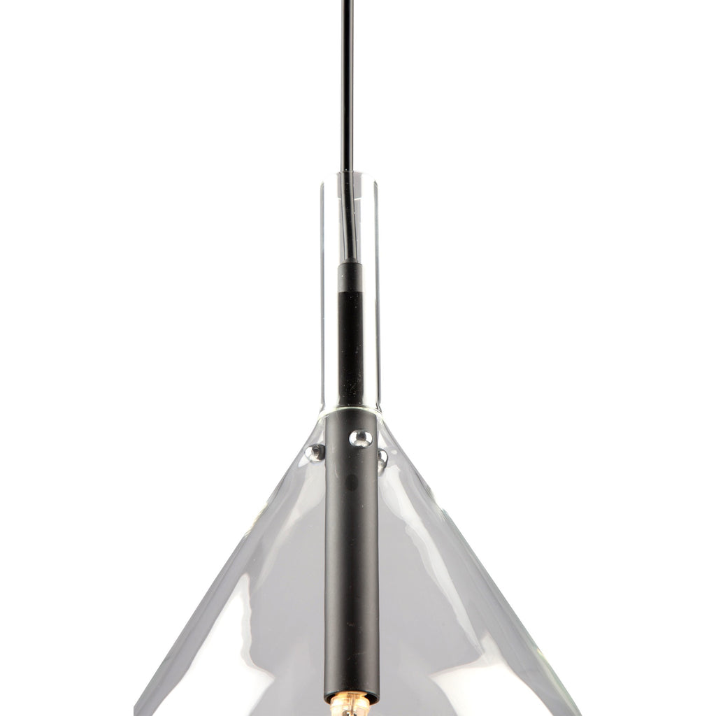 The Conic collection features a uniquely shaped glass design suspended on black frames. The glass is suspended by 3 nickel bullets to give it a floating effect. The bottom of the glass is open for each access to the bulbs. To finish off the design, the wiring has black textile covering.