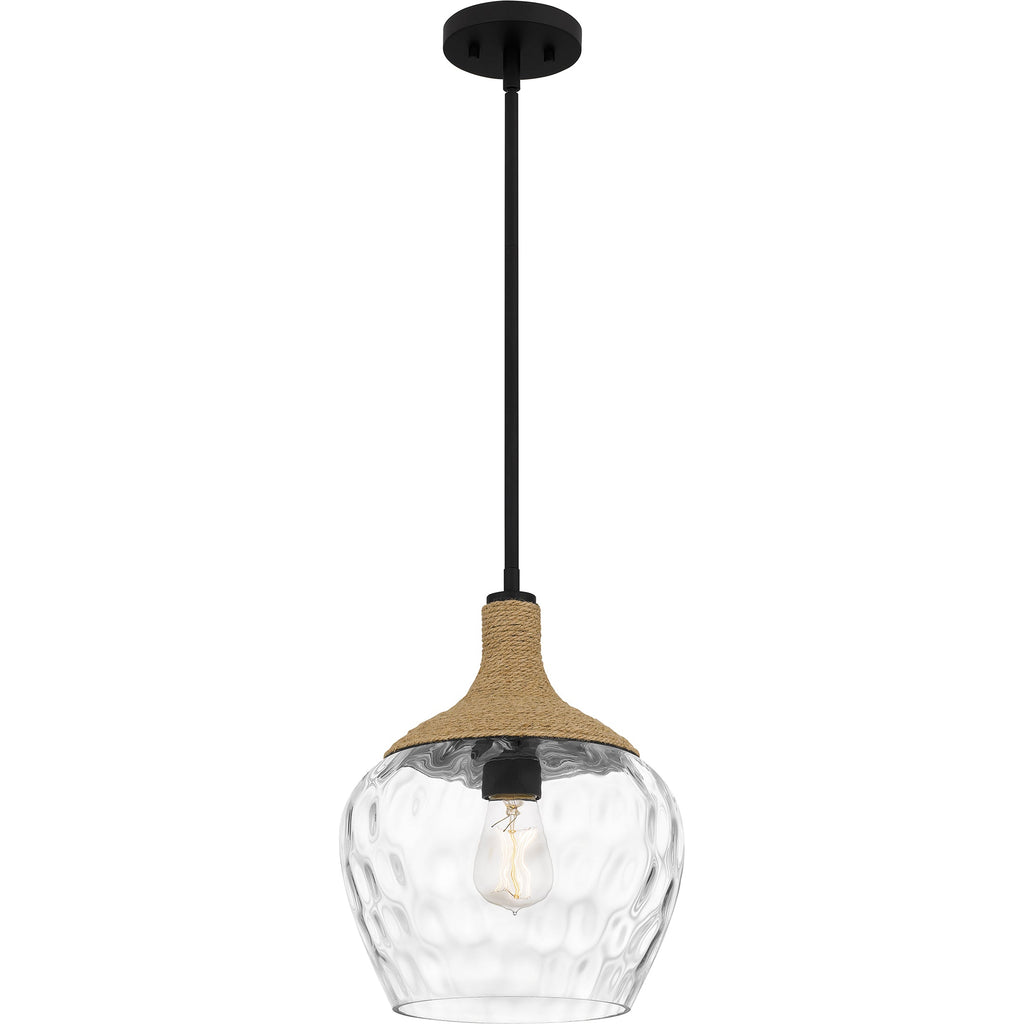 Part of the Quoizel Naturals series, the Royer one-light pendant exemplifies modern bohemian style. Rope detailing surrounding the top of the glass globe shade calls to mind coastal elements. Choose from either clear water glass or opal etched glass – both finished in a handsome matte black.