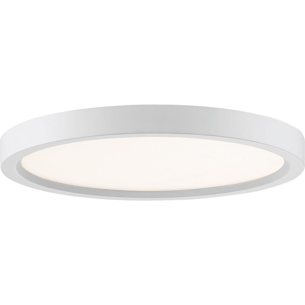 Available in three finishes and three sizes, the Outskirts flush mount is suited for a variety of room applications. In your choice of brushed nickel, white or oil-rubbed bronze, it is featured in sizes of 7.5”, 11” or 15”. The white acrylic shade is illuminated with integrated LED technology and the thick canopy adds depth to the simple structure.