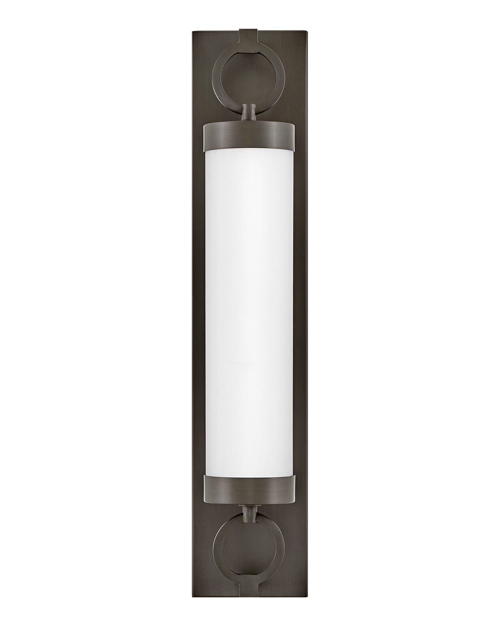 For a fixture that is an industrial piece of art, look to Baylor. The sturdy back plate and decorative rings add a nice balance to the etched opal glass to finish off the strong, substantial look. Ideal for providing plenty of functional light, Baylor mounts cleanly to the wall vertically or horizontally to bring style to primary bath, powder rooms, and more. Baylor is part of the Lisa McDennon Collection.