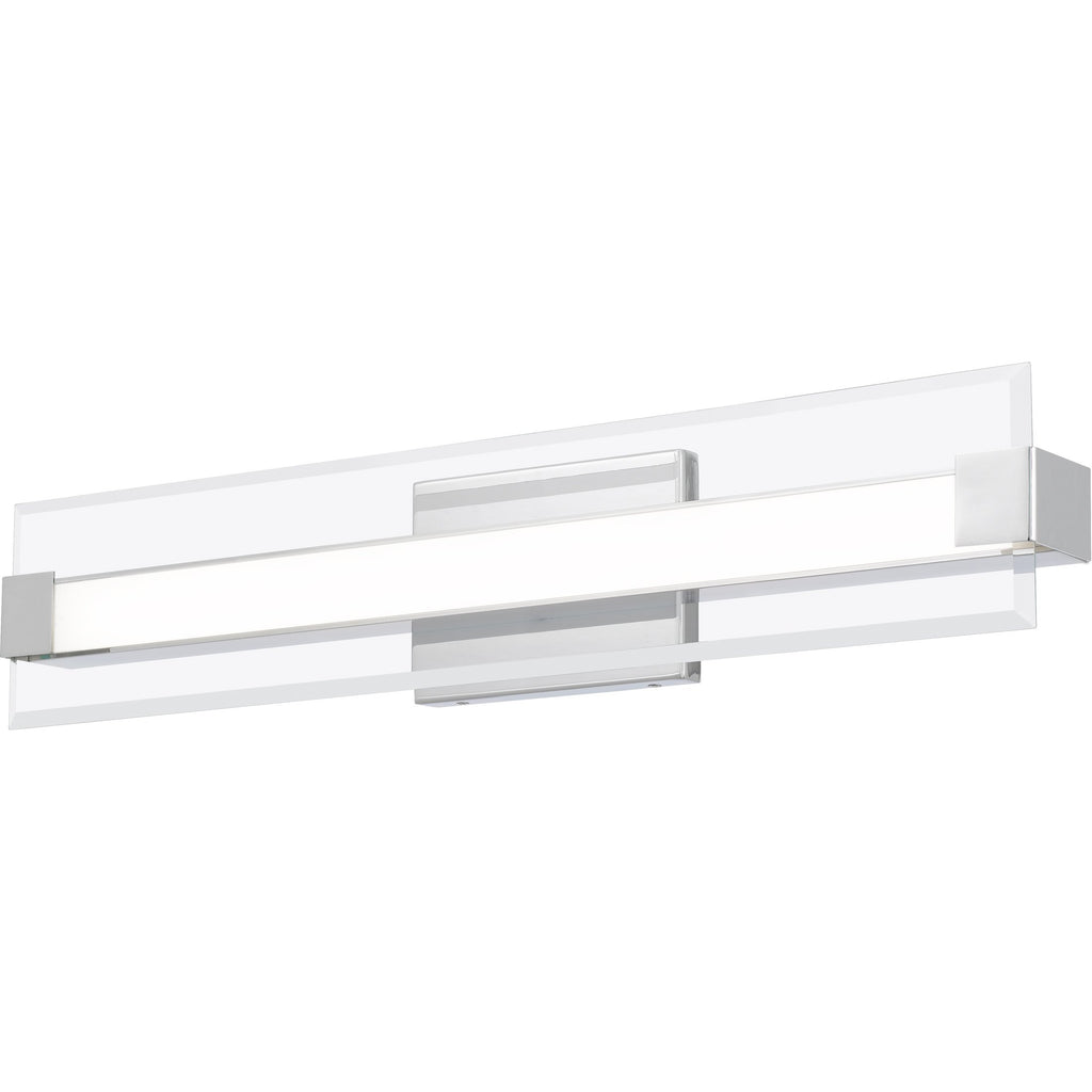 The Salon collection is modern minimalism at its finest. Clear beveled glass floats in the foreground, while a sleek integrated LED radiates from behind. The layered components are secured by discreet end brackets to a glossy backplate which are both finished in polished chrome for a contemporary shine.