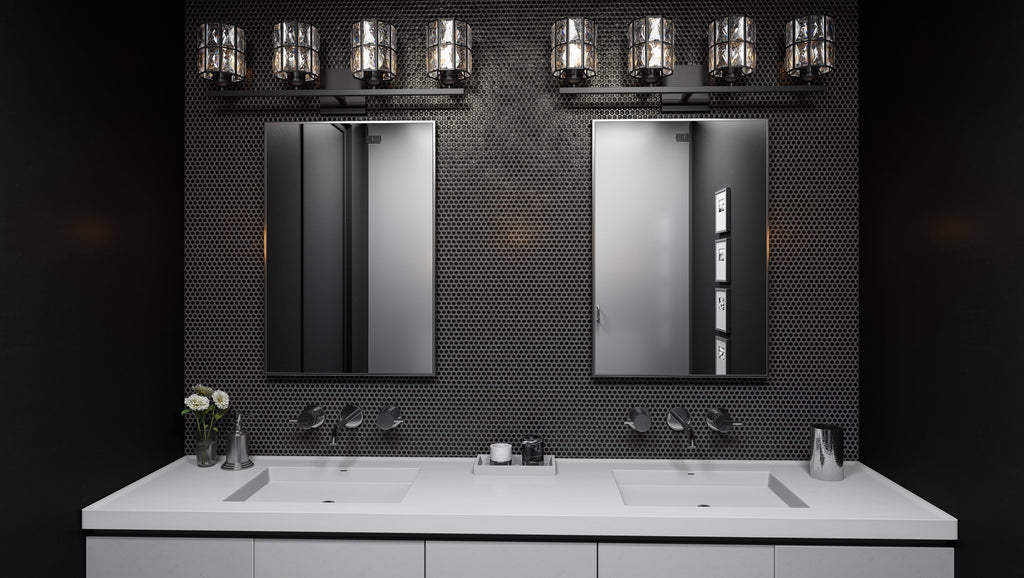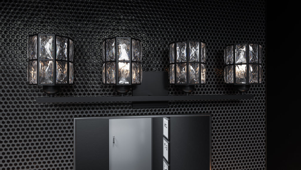 Add a glamourous touch to your bathroom with the Gibson collection. The cylindrical shades are made up of faceted crystals that pop against the Matte Black finish, giving this fixture a chic and eye-catching design. This can be hung as an uplight or downlight depending on your preference.