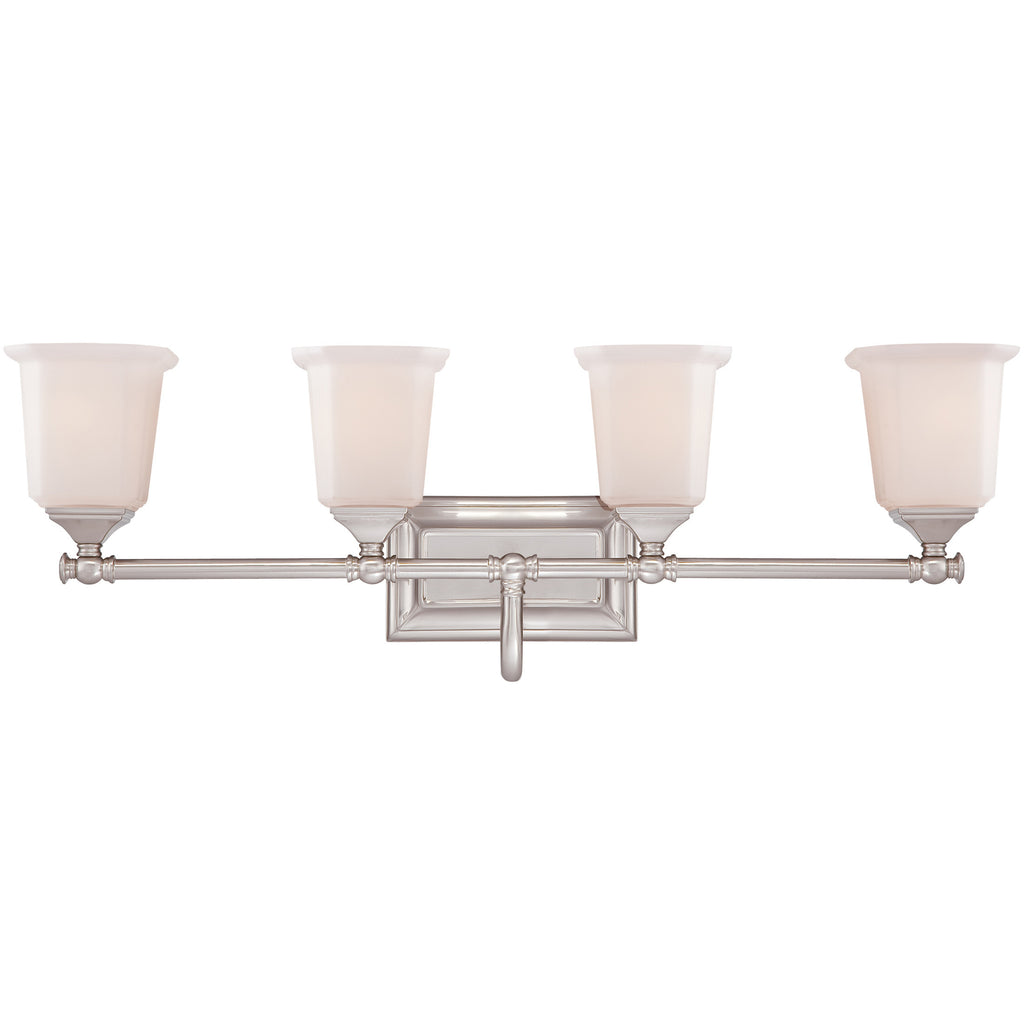 This gleaming collection gives a solid nod to mid century style. The squared shape of the opal etched glass shades gives this design an edge and it is complemented beautifully by the rectangular backplate.
